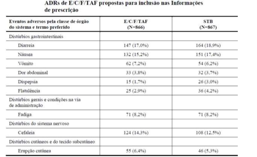 A totalidade dos resultados das avaliações renais em indivíduos adultos e adolescentes infectados por HIV, em todo o programa de desenvolvimento clínico, demonstrou que o tratamento com F/TAF está associado a um perfil de segurança renal preferencial em comparação com STB ou regimes contendo TDF.