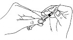 - Inserir a agulha na vertical no centro da tampa de borracha do frasco-ampola de pó liofilizado e inserir o diluente lentamente, para evitar a formação de bolhas;