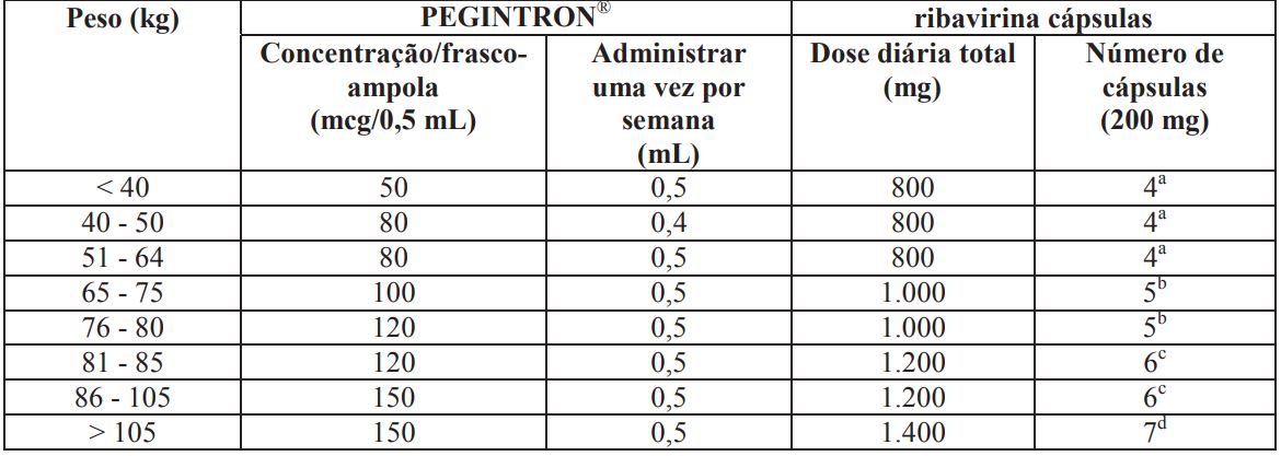 Como uma alternativa para o cálculo exato da dose, uma dose simplificada de Alfapeginterferona 2B foi desenvolvida baseada em experiência de estudos clínicos (ver Tabela 10). Essa tabela coordena a dose simplificada de Alfapeginterferona 2B por grupos baseados em peso e indica a dose da apresentação mais apropriada. Ela também indica a dose correspondente de cápsulas de ribavirina.