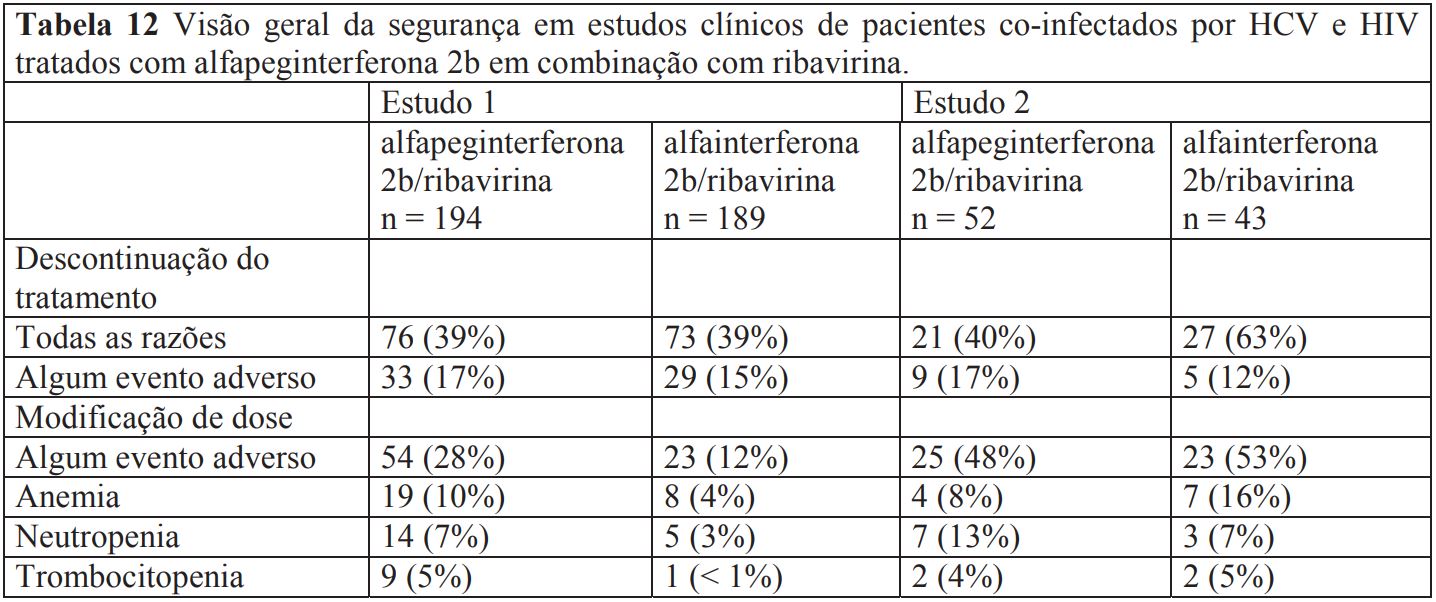 A alfapeginterferona 2b, quando usada em combinação com ribavirina, não causou nenhum efeito não observado previamente com outra substância ativa ou mesmo isoladamente. A maioria dos eventos relacionados ao tratamento foi anemia leve a moderada reversível e a gravidade desses efeitos foi maior do que quando o tratamento foi realizado com a substância ativa isoladamente.